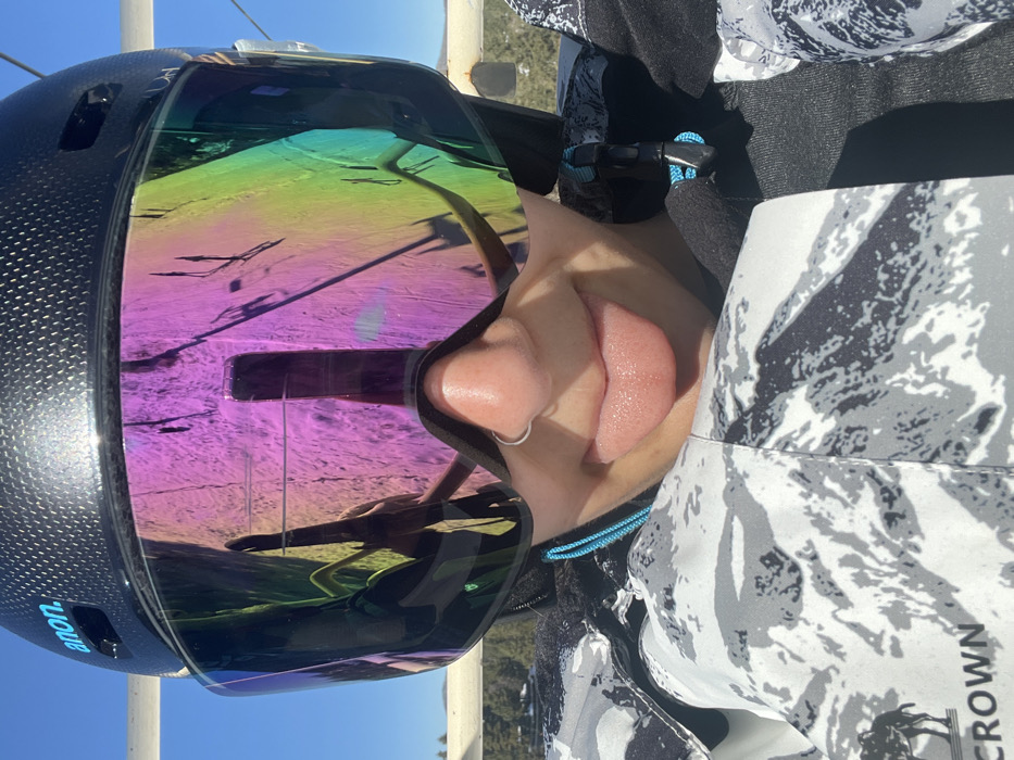 A person, wearing a black and grey patterned snow jacket and a black helmet with a rainbow-colored reflective visor, sticks their tongue out. A silver nose ring is visible. The helmet, labeled “anon,” reflects a snowy landscape and possibly a chairlift. Blue sky is visible in the background.
