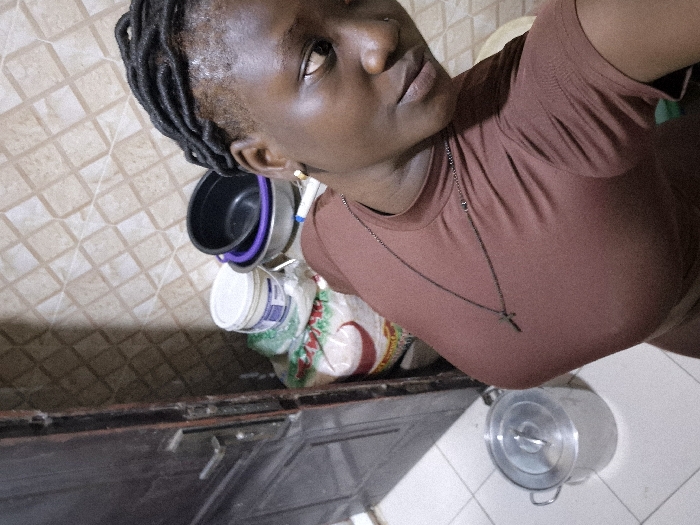An angled, eye-level shot reveals a woman in a brown t-shirt and necklace, gazing upward. Her hair is styled in neat braids. In the background, a kitchen scene unfolds with patterned wall tiles, a dark-toned cabinet, and a white floor. Stacked metal bowls, a white container, and a rice bag are visible on the cabinet. A covered metal pot sits on the white tiled floor. The overall lighting is soft, accentuating the woman's features.