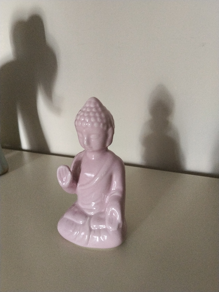 - "A small, glossy, light pink ceramic Buddha statue is centrally positioned on a flat, light beige surface in a location within Vila Real, Portugal" by FM-xkd7v1, licensed under CC BY 4.0