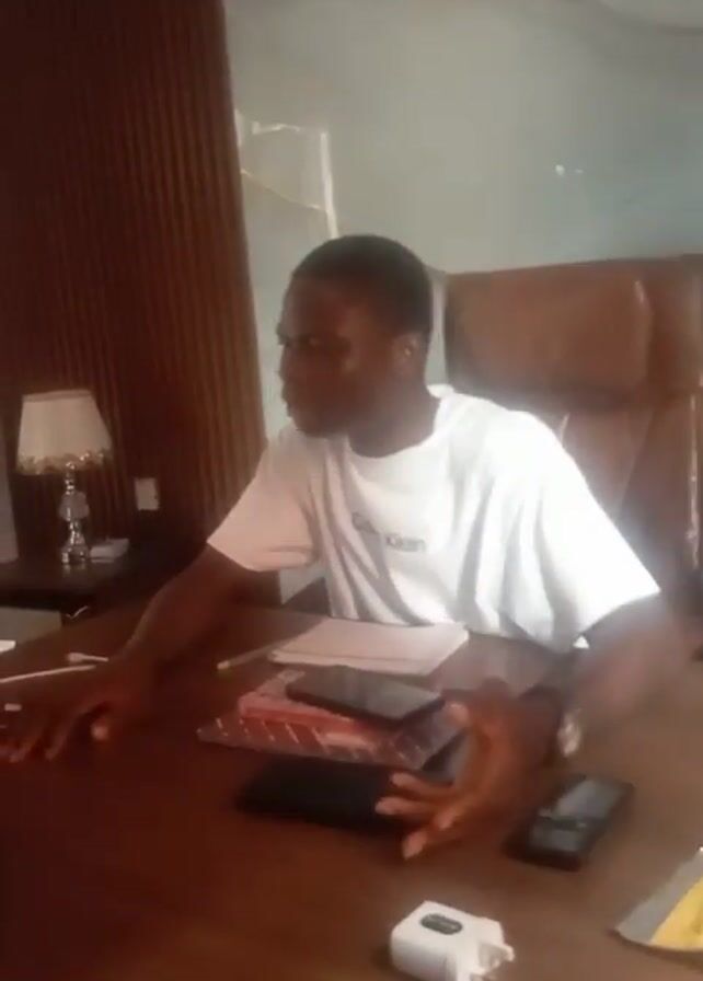 two people in an indoor setting that looks like an office. One person, wearing a white t-shirt with a "Calvin Klein" logo, is seated behind a brown wooden desk. On the desk are items including books, mobile phones, and a white adapter. The person in the white t-shirt appears to be talking and gesturing with their hands. Another person wearing a black t-shirt and blue shorts, enters the frame and places some green packaged items on the desk. A standing fan is visible in the background. The environment appears simple with a white wall with cracks and brown wooden decorative panels.