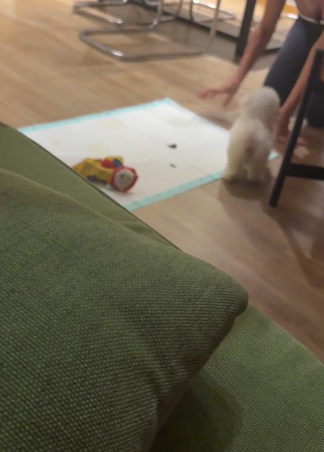 From a low angle on a green couch, a woman interacts with a small white dog. She points at a toy on a training pad, encouraging the dog. The dog stands facing away from the camera, its rear visible. The scene takes place on a wood floor in a room with furniture.