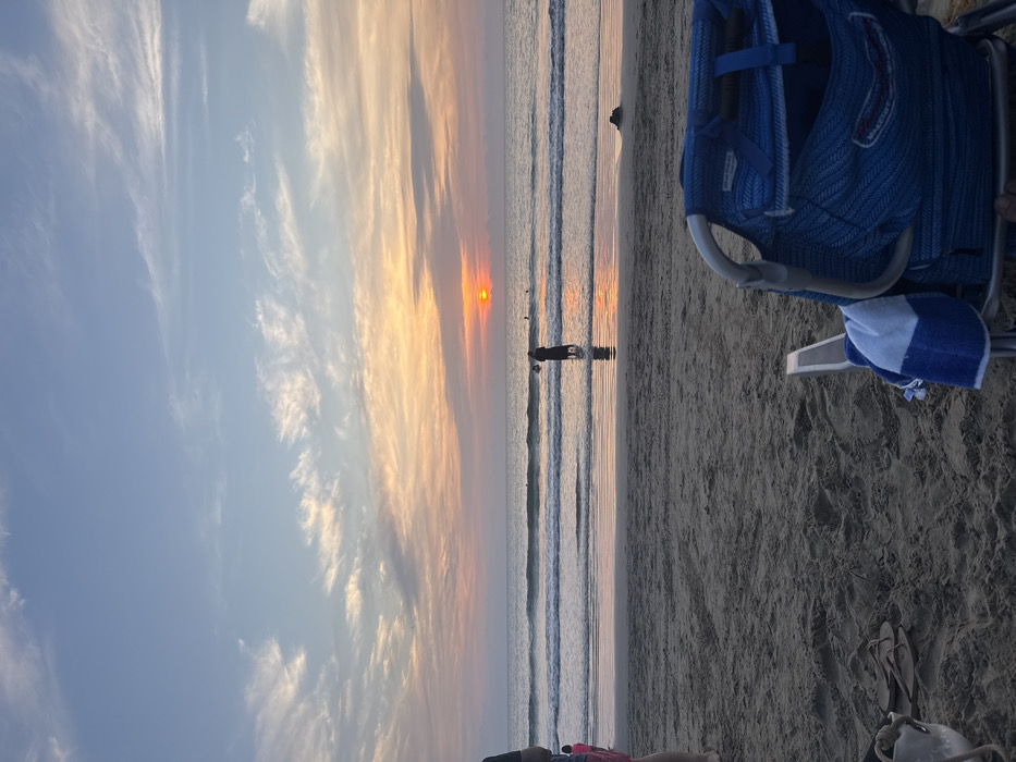 A beach scene during sunset with orange hues. The sun is a small, bright orb on the horizon. Silhouetted figures stand in the water. Gentle waves roll onto the sandy shore. A blue beach chair occupies the right side, with a blue and white towel draped over its arm. The sand is coarse and dark. The sky features wispy clouds, transitioning from blue to orange near the sunset.