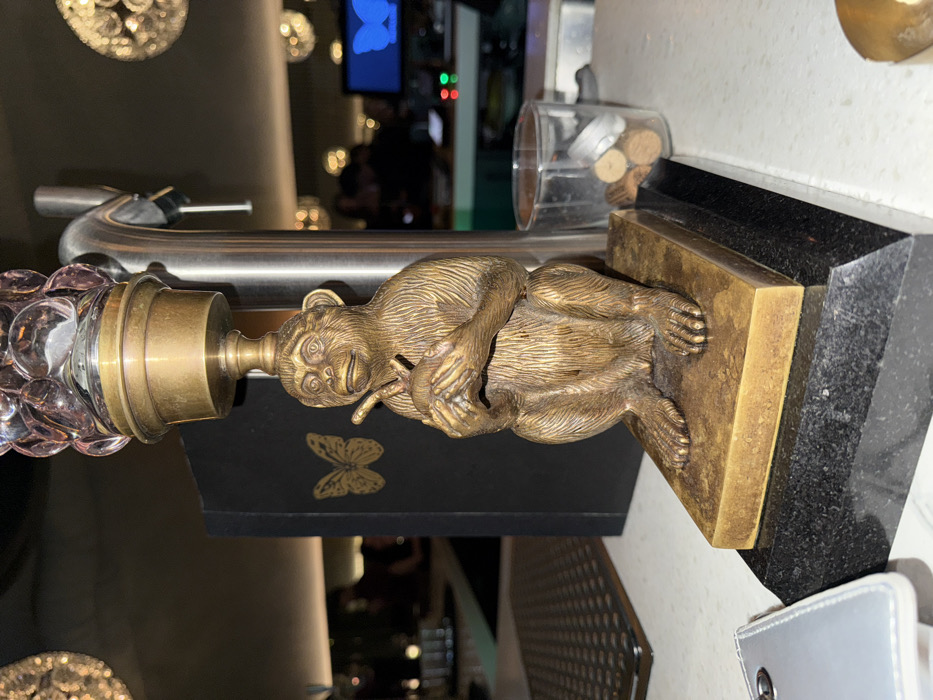 - "A decorative lamp or light fixture with a polished steel arm and a faceted, glass globe, features a small, bronze monkey sculpture affixed to a square black base with a butterfly motif" by FM-wzXZC3, licensed under CC BY 4.0