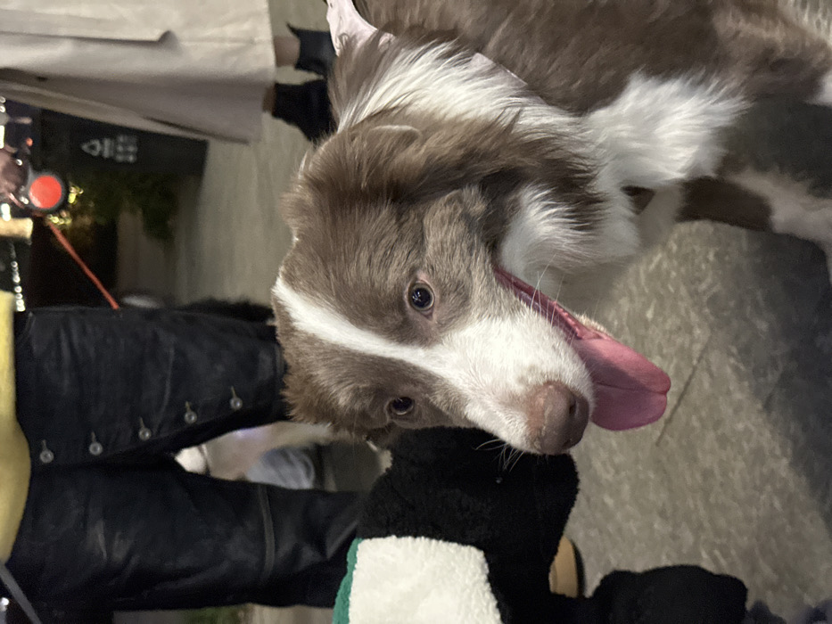 The image depicts a nighttime outdoor scene in Xiaoshan District, China. The central subject is a medium-sized brown and white dog, likely a Border Collie or similar breed, positioned prominently in the foreground. The dog has dark eyes, a brown nose, and a pink tongue extended from its mouth, suggesting panting. White fur forms a blaze between its eyes and extends down its muzzle, chest, and underside, contrasting with its dominant brown coat. A light pink harness or collar is partially visible on its back. In the background, multiple individuals and other animals are partially visible. To the left, the lower torso and legs of a person wearing dark, possibly leather, pants with prominent vertical button details are seen. A yellow garment is visible above the pants. A small, light-colored dog is partially obscured behind this person's legs. Another black object, possibly a stuffed toy or a small dog in an outfit, is near the ground to the left of the main dog. To the right, the lower legs of a person wearing a light-colored, possibly beige or white, long coat and dark boots are visible. This individual holds a red retractable dog leash handle in their right hand. Behind this person, a dark-colored waste bin with white symbols is present. The ground is a paved surface, possibly concrete, appearing dark under the low light conditions. The background is out of focus, showing blurred artificial lights, including a distinct red light, consistent with an urban or public park environment after dark. The overall scene suggests a casual gathering of dog owners and their pets.
