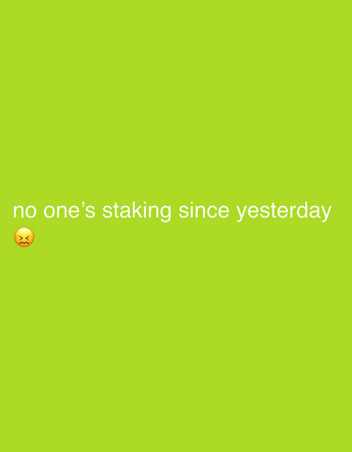 The image displays a uniform, solid lime-green background. Centered horizontally in the lower-middle portion of the frame is white, lowercase sans-serif text that reads: "no one's staking since yesterday". To the immediate left of the word "no one's" is a yellow emoji depicting a face with "X" shaped eyes and a wavy mouth, commonly known as the nauseated or frustrated face emoji. No physical location, city, or specific environment, including Reims, France, is depicted. There are no people, other discernible subjects, objects, actions, or interactions present in the scene.