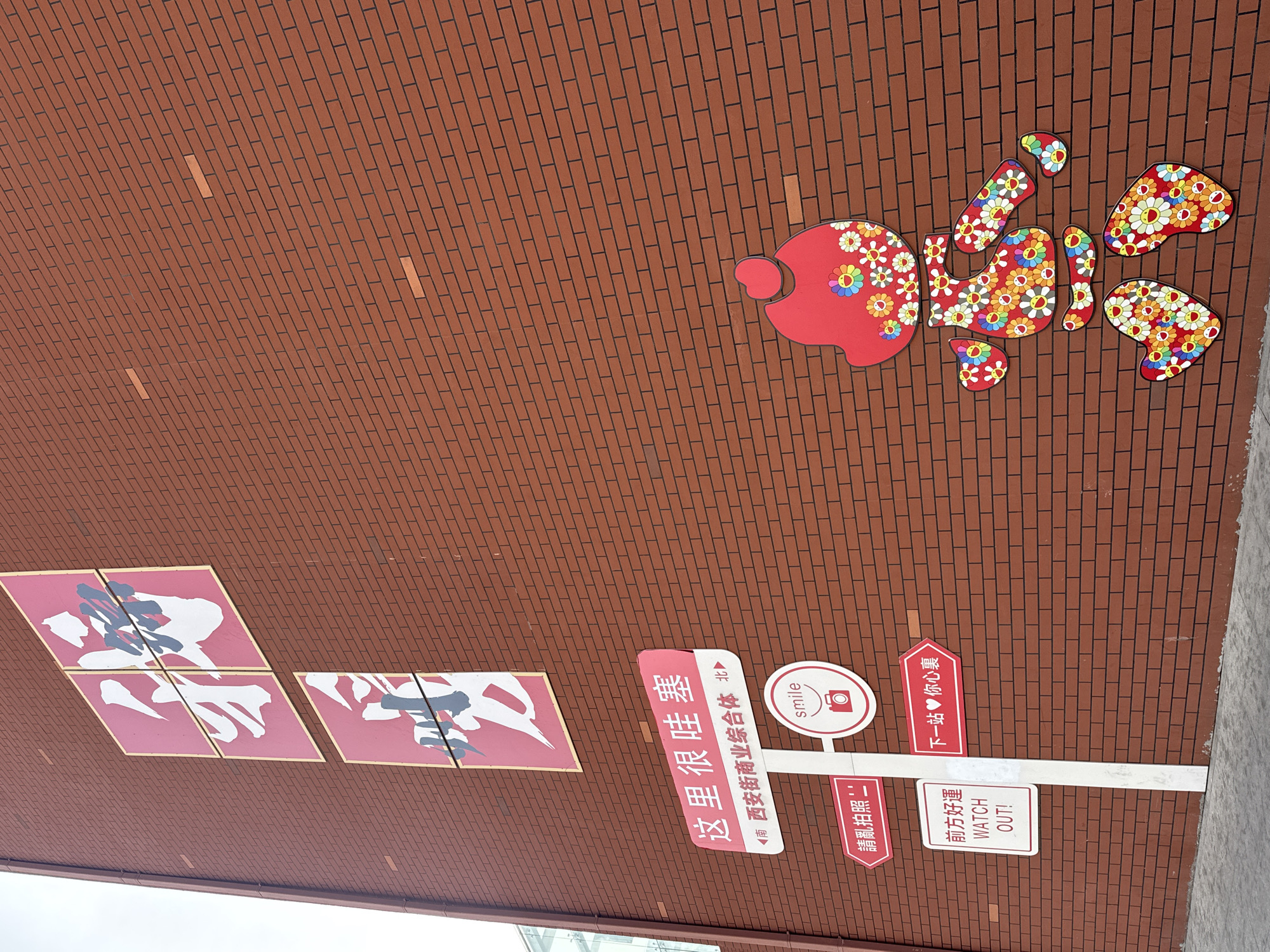 brick wall in Guta, China with various signs and decorations. The wall is mostly red brick with black grout. On the right side of the wall, there is a multi-colored floral-themed image of what appears to be a decapitated cartoon fish. On the lower right of the image, several signs are affixed to poles. The signs feature Chinese characters and English phrases. These include the phrases "smile," "请乱拍照" [Please do not take pictures randomly], "前方好運" [Good luck ahead!], "WATCH OUT!," and "下一站♥你心裏" [Next stop, in your heart]. There is also a sign with larger Chinese characters: "这里很哇塞" [This place is very wow!] and "《南 西安街商业综合体 北" [South Xi'an Street Business Complex North]. Near the top left of the wall, there are four white signs on a pink background, also with Chinese characters.