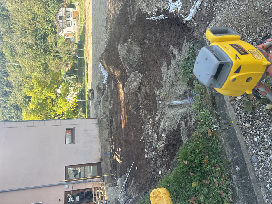 The image displays an active construction site in Châtenois, France, under clear daylight conditions. In the immediate foreground, a yellow and grey laser level, mounted on a tripod, is positioned on a gravel surface adjacent to a concrete curb and a strip of green grass. A large, irregular excavation pit dominates the midground, exposing layers of dark topsoil and lighter subsoil. Several white PVC pipes and black utility lines are visible within and around the excavated area. Piles of disturbed earth and rocks are situated next to the pit. A yellow plastic container rests on the grass verge to the left of the excavation. Abutting the left side of the pit is a light-colored building, possibly pale pink or beige, featuring a dark brown door adorned with a large butterfly decal and a single rectangular window. A yellow measuring tape or line extends from near the building's door into the excavation. In the background, beyond the immediate construction zone, a wide expanse of leveled, disturbed earth is visible, leading to a distant fence line. Behind this, a light-colored, multi-story house with dark trim and a prominent balcony is situated, backed by a densely wooded hillside exhibiting varied green and yellow autumn foliage. No individuals or active construction machinery are visible in the scene.