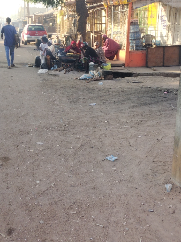 A group of women are cooking food on a makeshift stove along a street. One woman is actively frying food in a large pan. Other individuals are sitting nearby, possibly customers or helpers. In the background, a red car is parked on the street. There are various containers and items scattered around the cooking area. The street itself is dusty and appears somewhat unpaved. A man walks away on the left side. The sky looks bright, indicating it may be midday.
