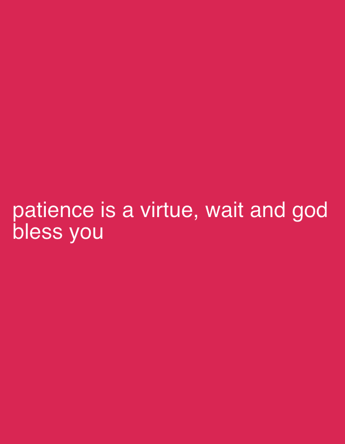 The image displays white text against a uniform, solid red background. The text is rendered in a sans-serif font, positioned towards the bottom-center of the frame, and reads across two lines: "patience is a virtue, wait and god bless you". No individuals, subjects, objects beyond the text, actions, interactions, or discernible environmental elements are present within the visual information provided. The image contains no visual data to indicate a location in Newcastle upon Tyne, United Kingdom, or any other specific geographical setting.