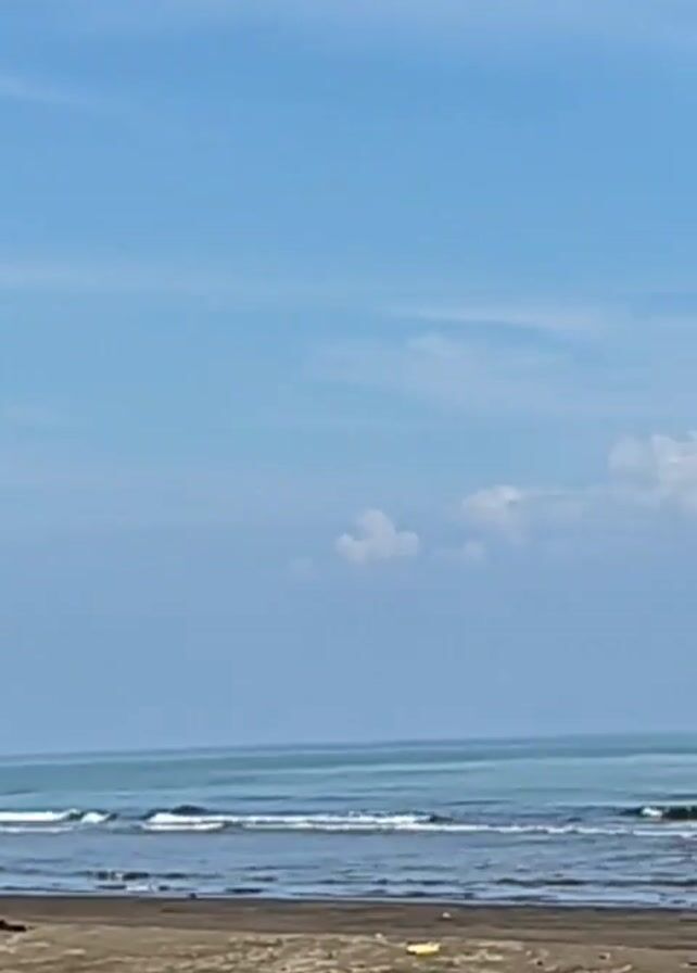beach scene on a clear day. The sky is blue with some scattered white clouds. The ocean stretches to the horizon with gentle waves breaking on the shore. The sand is a brownish color, and there is some visible debris. Several people are seen walking and playing in the shallow water near the shoreline.