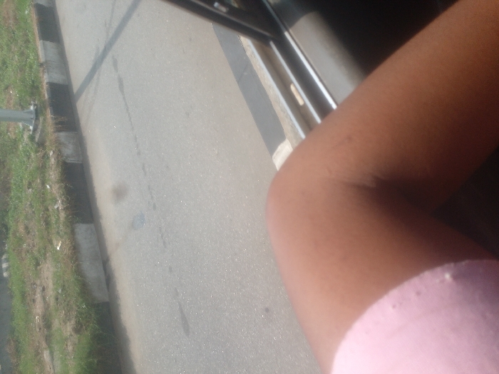 The image depicts a scene observed from inside a vehicle in Alaiyabiagba, Nigeria. In the foreground, a human leg, identified as a thigh with medium-dark skin tone, is partially visible on the lower left and center, clad in light pink fabric. The interior frame of a vehicle window is present along the right edge. Outside the vehicle, a gray asphalt road surface extends across the mid-ground. This road is bordered by a concrete curb painted with alternating black and white stripes. Beyond the curb, a strip of ground features sparse green grass and exposed soil, with a slender, light-colored pole standing vertically in the upper right background. No specific actions or direct interactions are discernible beyond the passive observation from the vehicle.
