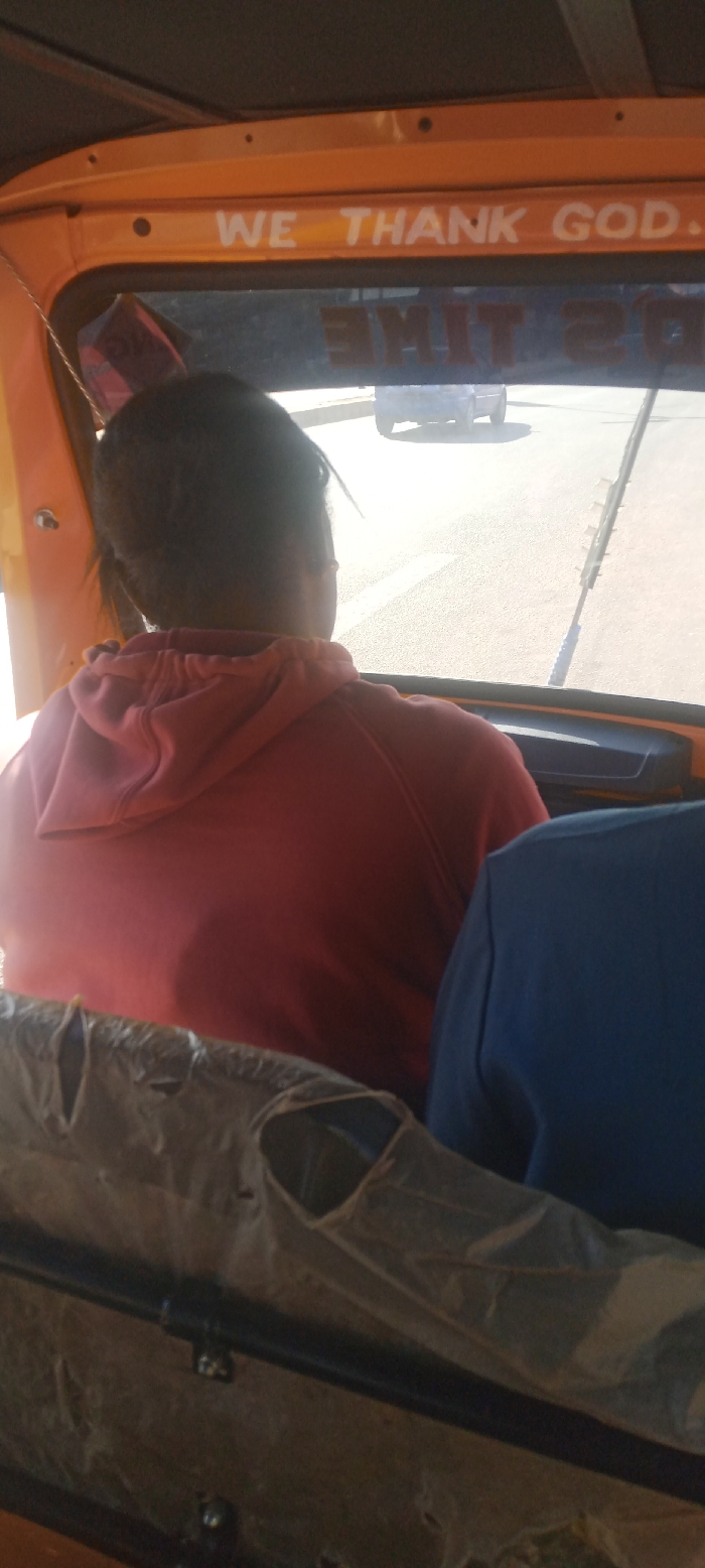 The image depicts an interior view from a vehicle, likely a tricycle, looking forward onto a paved road in Sabon Tasha, Nigeria. A person is seated in the foreground, viewed from behind, wearing a red hooded sweatshirt with dark hair tied back. To the right of this individual, a portion of a blue garment suggests the presence of another person. The vehicle's orange interior frame is visible, with white text reading "WE THANK GOD." affixed above the windshield. Red, reversed text, partially legible as "S TIME," is present on the windshield. A single windshield wiper blade is visible on the right. Below the occupants, a dark, worn barrier or seat with a horizontal black bar extends across the frame. Outside the vehicle, a light-colored paved road is visible under bright sunlight, with a lighter-colored vehicle driving in the distance.
