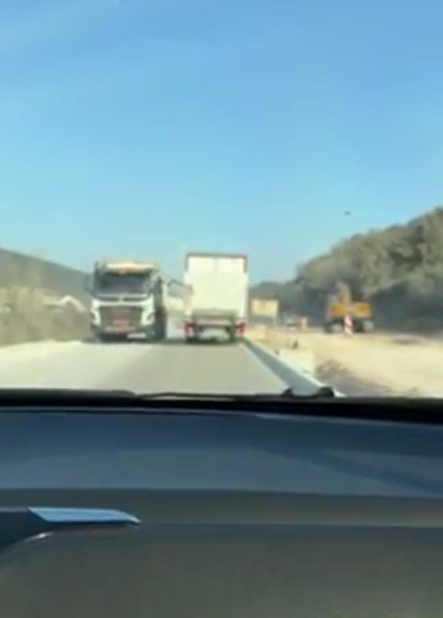 The view from inside a car driving on a road approaching road construction is captured in this video. In front of the car, there are two trucks, one a dump truck and another a white transport truck with the number "3" in red on the back. To the right of the road, an excavator is visible. The road is lined with bare trees and dusty terrain, with a clear blue sky overhead. Other vehicles can be seen moving in the distance amidst the dust. The perspective is from the driver's seat, focusing on the road ahead.
