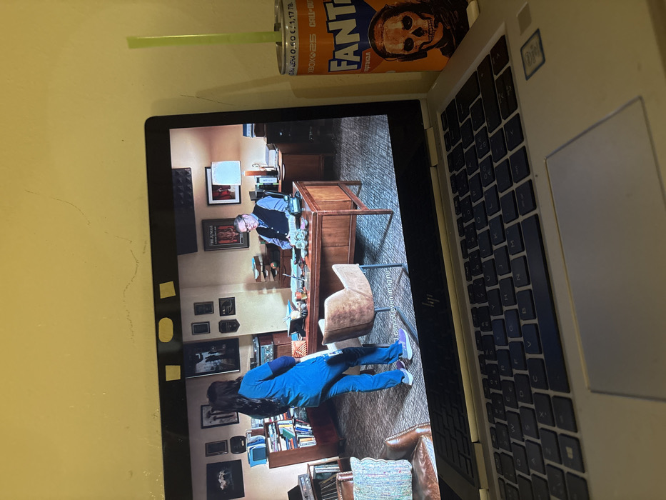 An HP laptop with a silver chassis and dark keyboard is open, displaying video content on its screen. The content shows an indoor office scene with two individuals: a female in blue medical scrubs, seen from behind and standing, and a male in a dark vest and glasses, seated at a large wooden desk. The office walls are adorned with framed pictures, and bookshelves filled with books are visible. Subtitles at the bottom of the screen read, "I cannot even imagine." Three small, light-colored adhesive notes are affixed to the top bezel of the laptop screen. To the right of the laptop, an orange Fanta can, featuring a "Call of Duty: Ghost" character and "XBOX SERIES X|S" branding, stands upright with a neon green straw inserted. Cyrillic text on the can confirms it is "Портокал" (Orange) flavored and has a volume of "0.50 L." The can's labeling, specifically the Cyrillic text and "0.50 L" volume, indicates the product is from Bulgaria, placing the scene within the city of Varna, Bulgaria, as specified. A plain, light yellow wall is visible behind the laptop and the Fanta can. The immediate environment suggests an indoor, dimly lit setting.