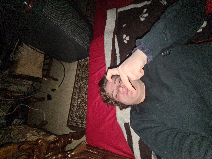 A person with curly, blonde hair lies on their back on a red and brown striped blanket. They wear a dark-colored sweatshirt and have their hand positioned near their face, with two fingers extended towards their nose. A dark-colored chair and a dark rectangular object are visible in the background. An ornate wooden chair and a portion of a patterned rug are also in the image.