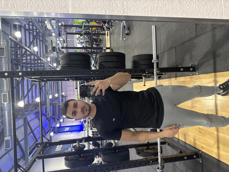 An individual is depicted taking a mirror selfie within a commercial gym facility. The location is identified as The Gym Group Dundee West, situated within Xscape, Dundee, United Kingdom. The subject is a male, appearing in his twenties to early thirties, with dark hair, a trimmed beard, and a mustache. He wears a black short-sleeved athletic top with a white logo on the left chest, light grey athletic sweatpants, and black and white athletic footwear. His right hand holds a black smartphone with a patterned case, angled to capture his reflection in the mirror. A tattoo is visible on his left forearm. The flooring in the immediate foreground consists of a light brown wooden section bordered by dark grey rubber gym mats. To the subject's left, a black metal squat rack holds a barbell loaded with multiple black weight plates. In the mirror's reflection, an identical squat rack is visible to the subject's right, similarly loaded with weight plates, and an additional empty silver barbell rests on its safety pins. The background, both directly visible and reflected, shows a spacious gym interior. The ceiling features exposed industrial ductwork, a metal grid, and numerous overhead lights, some emitting a blue light. Various exercise equipment, including weight machines, benches, and free weights, are arranged throughout the area. Indistinct figures are visible in the background, engaged in exercise. A blue wall with partial white text, "ONE" and "mud," is discernible in the far left background.