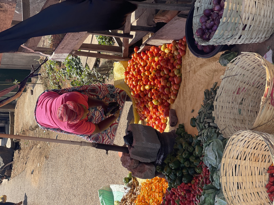 The image captures an outdoor market stall in Jos, Nigeria, under strong daylight conditions