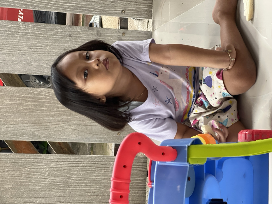 A young girl with dark hair and a lavender unicorn shirt sits on a bench. She is looking upward. Her legs are bent, and she wears shorts with a white and patterned fabric. Her left wrist has a gold bracelet. The lower half of the frame is filled with a blue and red toy. A piece of bread sits by her feet.
