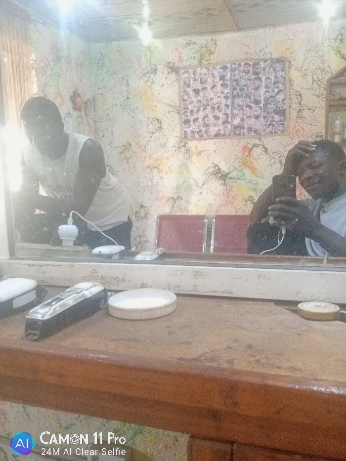 The image displays the interior of a barbershop in Unguwan Rimi, Nigeria, captured as a selfie reflected in a large mirror. **People:** 1. A male individual is visible in the right portion of the mirror's reflection, actively taking the photograph. He wears a light-colored t-shirt, holds a black smartphone in his right hand, and has his left hand positioned on his head. He exhibits a slight smile. 2. A second male individual, likely the barber, is reflected on the left side of the mirror. He wears a white sleeveless top and is leaning forward over the counter. His face is partially obscured by a bright light reflection. **Objects and Environment:** * The foreground features a worn, brown wooden counter. Arranged on the counter are two hair clippers (one black/silver, one white/silver), a round, shallow container filled with white powder, and a smaller, circular, light-colored object. * The background, as seen in the mirror's reflection, consists of walls with a distinctive multi-colored splatter-paint pattern (black, green, yellow, orange on a light base). * A framed poster showcasing various male haircut styles, including the visible text "BIG BOSS," is mounted on the reflected wall. * Two red chairs with metal frames are visible in the reflection behind the individual taking the selfie. * A white, possibly ceramic, object with a ribbed base and a white cord is positioned on the reflected counter. * A light-colored ceiling, possibly paneled, is visible at the top of the reflection. * A strong light source causes significant glare in the upper-central area of the mirror. * The lower-left corner of the image contains camera metadata: "CAMON 11 Pro" and "24M AI Clear Selfie."