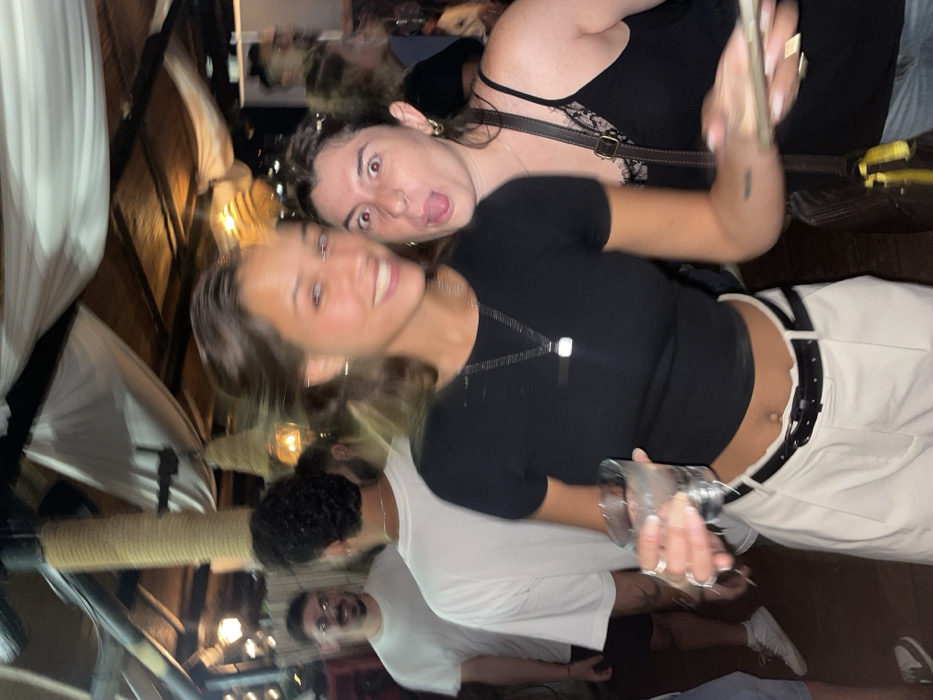 The image depicts an indoor social gathering, likely a bar or lounge, in the city of Unknown, Unknown. Two women are prominently featured in the foreground, posing for the camera. The woman on the left, with dark hair and fair skin, is smiling, wearing a black short-sleeved crop top, light-colored wide-leg pants with a black belt, and a silver necklace with a rectangular pendant. She holds a clear glass containing a beverage and ice in her right hand. Her hair exhibits motion blur. The woman on the right, also with dark hair, has her eyes wide open and her tongue extended in a playful gesture. She wears a black lace-trim camisole and gold hoop earrings. She holds what appears to be a stack of banknotes or cards in her left hand, and a brown shoulder bag with a yellow strap is visible over her right shoulder. In the blurred background, several other individuals are present. To the left, a man with a beard and glasses, wearing a white t-shirt, smiles towards the camera. Next to him, a man with dark curly hair, wearing a white t-shirt, faces away. The environment features a ceiling adorned with draped white fabric and wooden beams. A thick pole wrapped in natural-colored rope stands vertically. Multiple warm light sources illuminate the scene.