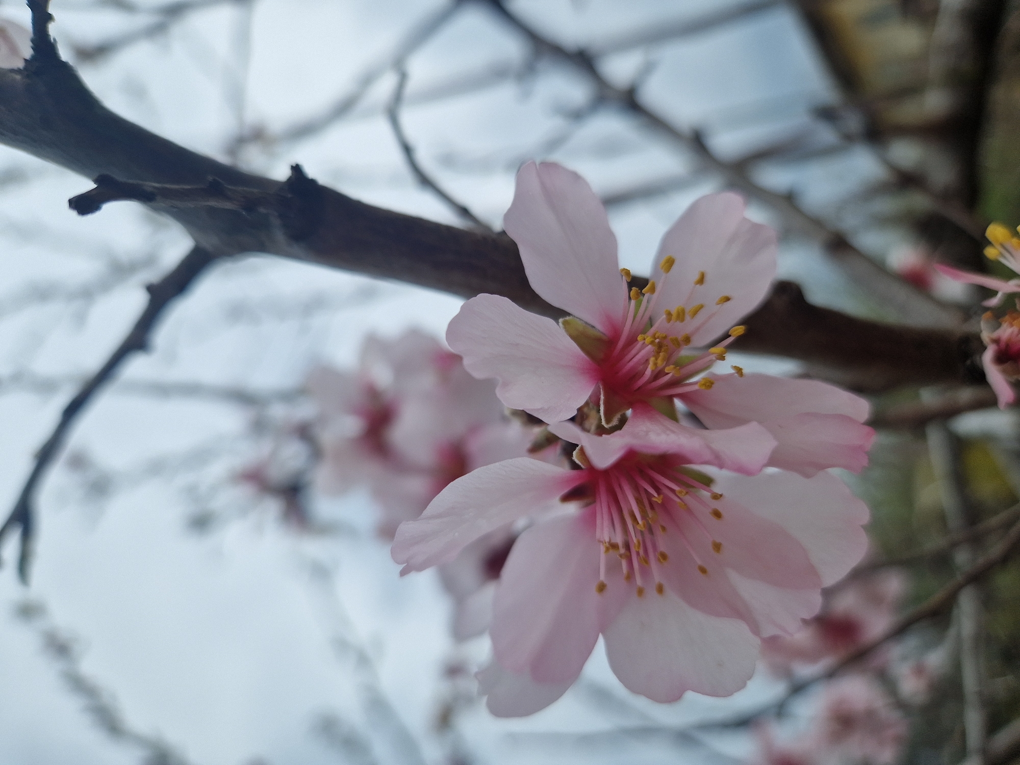 This image captures a close-up view of two light pink almond blossoms, sharply in focus, against a blurred background. The blossoms feature delicate pink petals, deep pink central receptacles, and numerous yellow-tipped stamens. A dark brown, bare tree branch runs vertically along the right side of the frame, with smaller branches extending into the blurry midground. The background consists of an overcast, light grey sky and indistinct bare tree branches. A faint, light-colored building, possibly yellow or cream, with a darker roofline, is discernible in the lower right background. Additional out-of-focus pink blossoms are visible deeper within the tree structure. The scene is located in the city of Kolena, Bulgaria. No people are present.