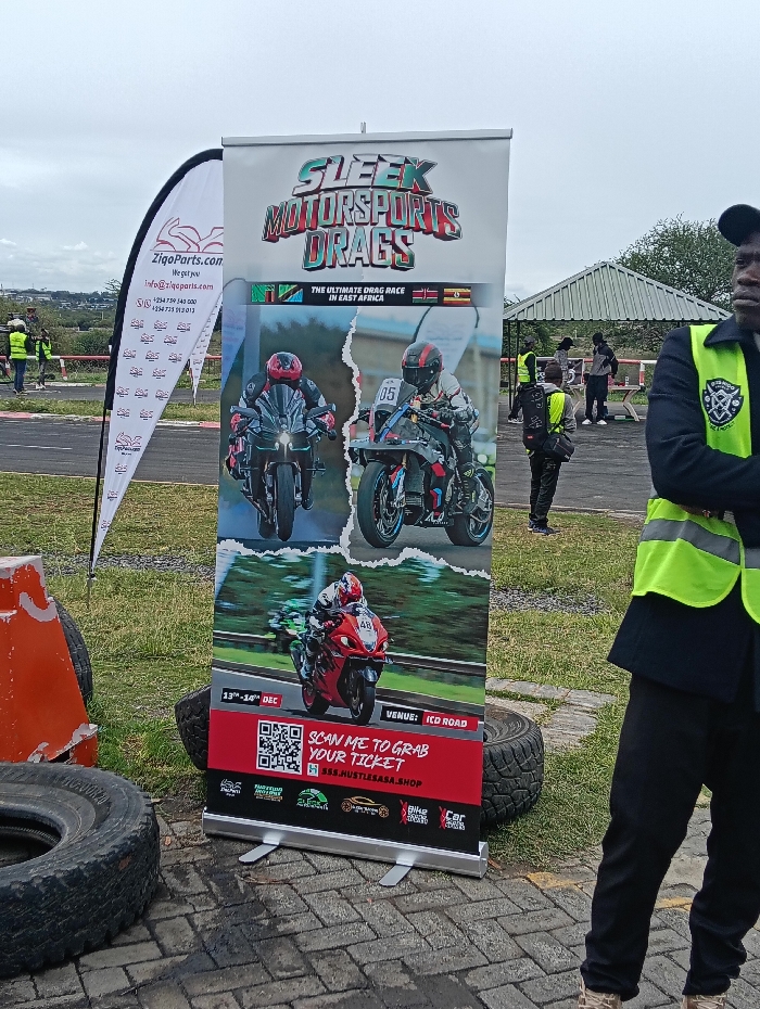 "Sleek Motorsports Drags" banner advertising "The Ultimate Drag Race in East Africa," scheduled for December 13-14 at ICD Road. The banner features images of motorcycles in action. A ZiqoParts.com banner is also visible. A QR code encourages viewers to scan for tickets at $$$HustleSasa.Shop. Tires are positioned at the base of the banner. A security guard and several people are in the background.