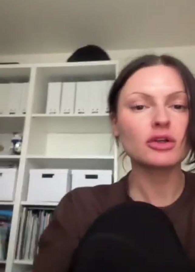- ". The video shows a fair-skinned woman with brown hair pulled back. She is wearing a brown long-sleeved shirt and black leggings. She is kneeling, facing the camera. Behind her is a white bookcase with white bins and binders. She says she has to go back to the dentist at 3:30 for the third time in a week. She holds up her hand, showing white nail polish." by FM-13LyK2, licensed under CC BY 4.0