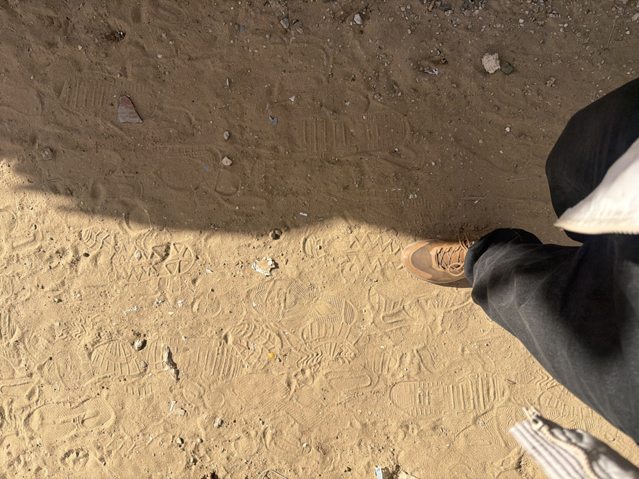 The image presents an overhead view of a sandy, dirt ground partially illuminated by sunlight. The ground is light brown and imprinted with numerous distinct shoe and boot sole patterns. Scattered small debris, including rocks, fragments of what appear to be plastic or paper, and a reddish-brown shard, are visible across the surface. A strong, dark, vertical shadow divides the ground, running from the top edge to the bottom, positioned slightly to the right of the image center. In the lower portion of the frame, the lower legs and right foot of a person are visible. The person is wearing dark-colored trousers and a light brown, laced shoe on the right foot. A piece of light-colored fabric, possibly striped, is partially visible on the person's left side and also at the far lower left edge of the frame. The scene is located in the city of Gaza, Unknown.