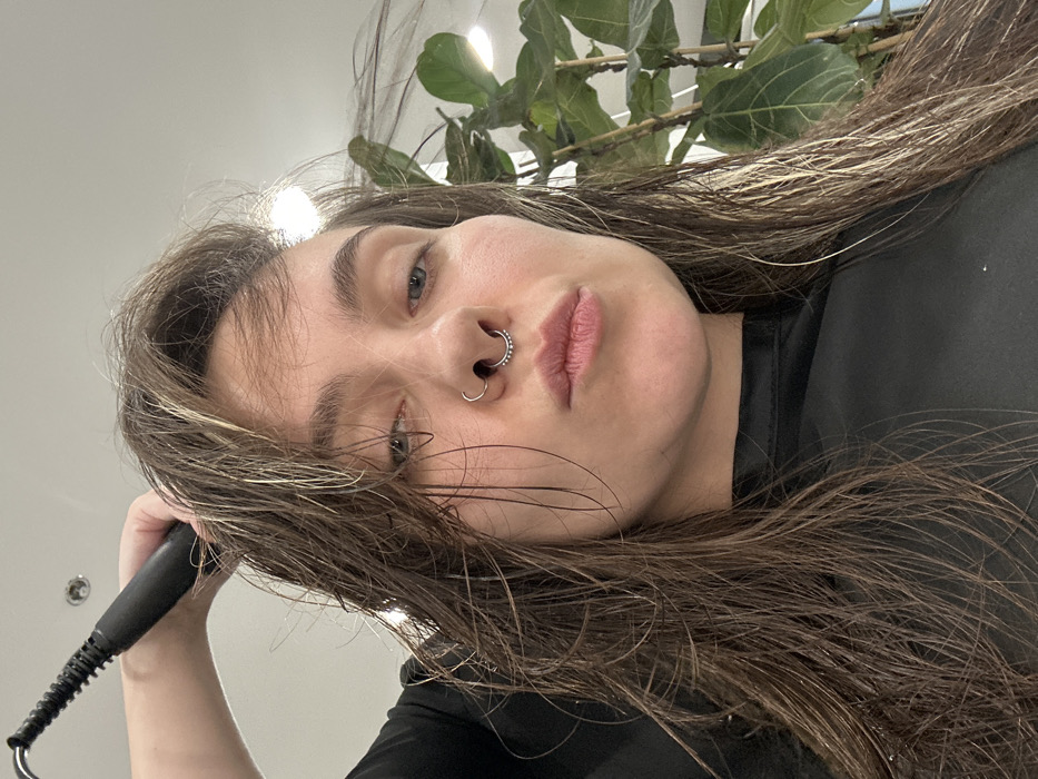 The image presents a close-up, head-and-shoulders view of a woman inside what appears to be a hair salon. The woman has long, wet, dark brown hair with visible lighter highlights. She is wearing a black, high-collared salon cape. Her face shows a decorative, beaded septum piercing and a plain ring in her left nostril. Her lips are slightly puckered, and her eyes are open, looking towards the camera. In the upper left, a hand holds a black, ribbed hair styling tool, possibly a hair dryer nozzle, directed at her hair. The background features a light-colored ceiling with a partially visible circular recessed light fixture and a large green plant with broad leaves on the right side of the frame. The overall environment is consistent with a commercial hair care establishment. There are no identifiable visual cues or landmarks within the image to confirm the specific location as Dnipro, Ukraine.