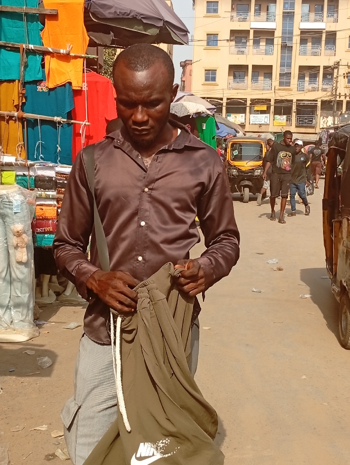 The image captures an outdoor street scene in Fegge, Nigeria. In the central foreground, an adult male with dark skin, short dark hair, and a short beard wears a dark brown, long-sleeved collared shirt and light gray cargo pants. A dark strap crosses his left shoulder. He holds an olive-green pair of track pants, which feature a white drawstring and a white "Nike" logo on the left thigh, while looking downwards at the garment. To the subject's left, a market stall displays various colorful clothing items, including orange, teal, and red t-shirts, hanging on racks. Mannequins, one holding a small teddy bear, are also visible, displaying light blue trousers. A large dark market umbrella provides shade above this area. In the mid-ground and background, a busy street is visible. A yellow motorized tricycle (keke napep) is prominent on the road, with other pedestrians, including two males in dark t-shirts and shorts, walking by. Distant multi-story tan buildings with numerous windows line the street. The ground is an uneven, dusty surface, with scattered pieces of light-colored litter.