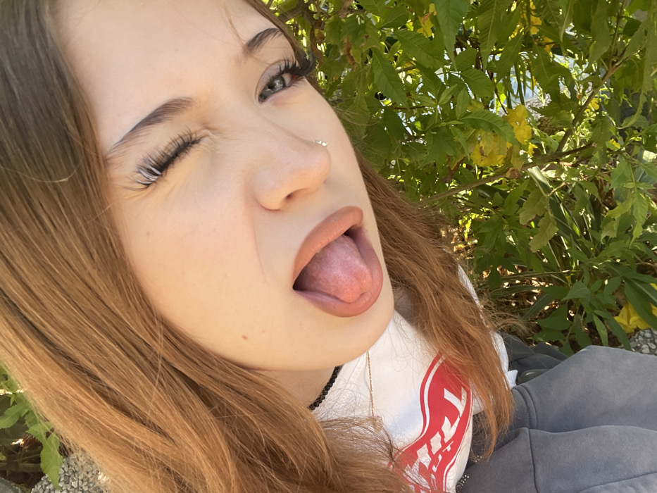 The image displays a close-up, angled portrait of a young adult female outdoors. Her head and upper torso are visible, positioned diagonally across the frame. She has long, light brown hair, a fair complexion, and light-colored eyes. Her left eye is closed in a wink, and her right eye is open. A small silver stud piercing is visible on her right nostril. Her mouth is open, with her tongue extended outward. She is wearing a white t-shirt featuring a red graphic design and a black choker necklace. A thin gold chain is also visible around her neck. The background consists of dense green foliage, suggesting a natural outdoor environment with direct sunlight. The specific location within Raanana, Israel, is not discernible from the visual information presented.