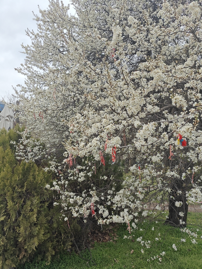 A large deciduous tree in full bloom with abundant small white flowers occupies the majority of the frame, set against an overcast sky in Sofia, Bulgaria. Numerous red and white twisted threads or tassels, varying in size, are suspended from the tree's branches. Some of these decorations exhibit additional colors such as yellow and blue. To the immediate left, a dense, dark green coniferous shrub or small tree is visible. Partially obscured behind this shrub in the upper left background is a light-colored, possibly beige, outdoor umbrella-like structure. The ground beneath the flowering tree consists of green grass with scattered white petals and blossoms, indicating recent shedding from the tree. No individuals or animals are present.