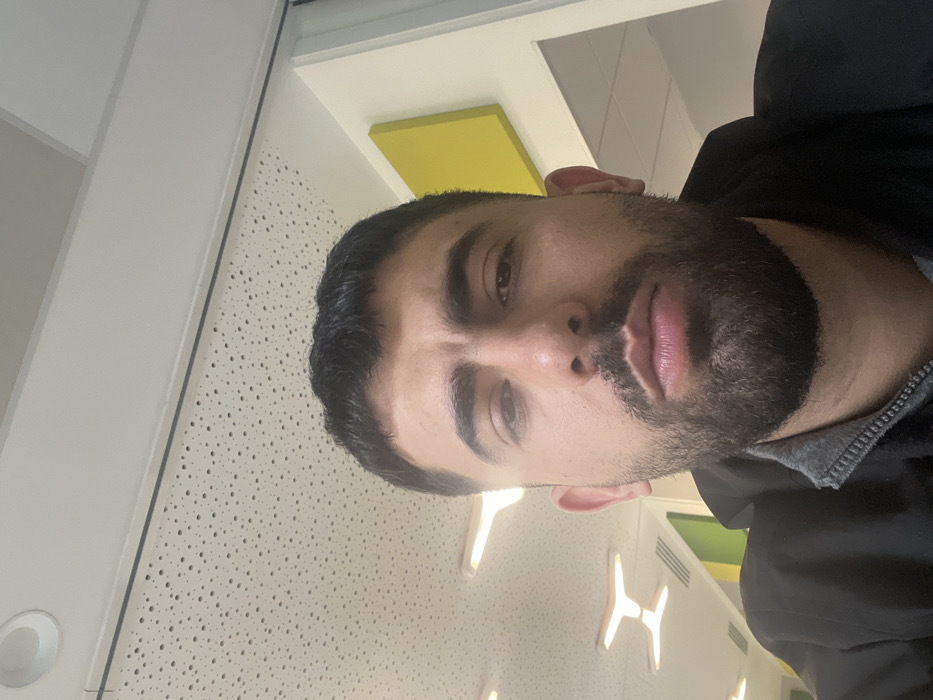 A head-and-shoulders portrait captured in the city of Roubaix, France, features a male subject looking directly into the camera. He has short, dark hair with faded sides, a full dark beard, and a neutral facial expression. The subject wears a black jacket over a grey garment with a visible zipper. The background reveals a modern indoor environment with a white perforated acoustic ceiling containing recessed circular lights and angular white light fixtures. A bright yellow rectangular panel and a partial green panel are visible on the light-colored walls behind the subject.