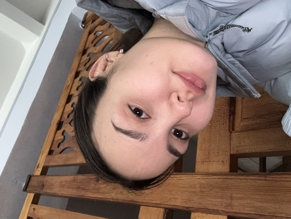 A close-up selfie depicts a young adult female indoors in Parizhskaya Kommuna, Russia. The subject's head is tilted, and she is looking directly at the camera with dark eyes. Her dark hair is visible, and her complexion is fair. She is wearing a light blue or grey puffer jacket; a black, beaded zipper pull is visible on the front. Her visible right ear features a clear stud earring in the earlobe and a small metal ring on the helix. The background includes a light brown wooden structure, possibly a bed frame or room divider, characterized by vertical slats and an ornate carved design along its upper section. A plain, light-colored wall or ceiling is visible above the wooden structure.