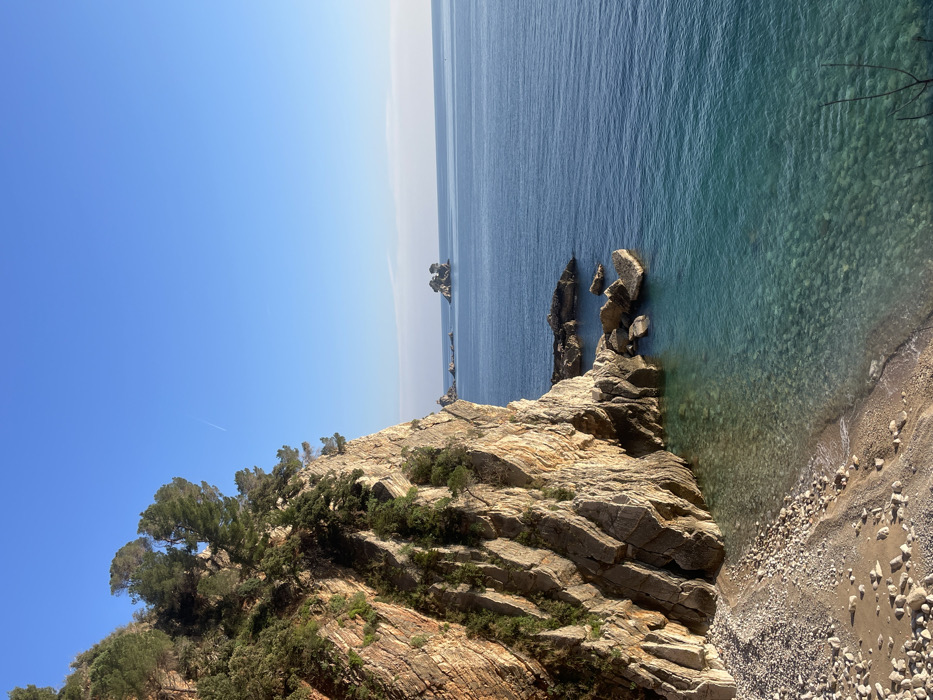 The image depicts a coastal scene in Perazića Do, Montenegro, under clear daylight conditions. A prominent, layered rock cliff, primarily light brown and grey, occupies the left side of the frame, extending from the foreground to the mid-ground. Green vegetation, consisting of trees and shrubs, grows on the upper sections and crevices of the cliff face. At the base of the cliff, a narrow pebble beach with light-colored stones extends along the shoreline. The Adriatic Sea occupies the central and right portions of the image, displaying clear turquoise water near the shore where submerged pebbles are visible, transitioning to a deeper blue further out. Small rock formations and islets are visible in the sea near the cliff base and in the mid-distance to the right, with one distinctive small rocky islet featuring sparse vegetation. The sky above is a clear, bright blue, with a single white contrail visible in the upper left quadrant. No people or active human interventions are visible.