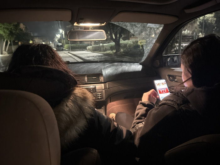 The image depicts the interior of a vehicle at night, viewed from the rear passenger compartment, situated in Glyka Nera Municipal Unit, Greece