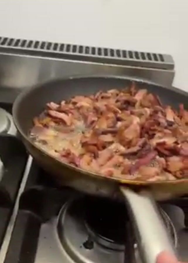 A close-up, shaky, POV video shows a hand holding a frying pan over a lit gas stovetop burner. The pan contains sauteed onions and bacon. The hand shakes and tosses the pan contents by moving the pan back and forth. The pan and stovetop are clean and are surrounded by white walls.