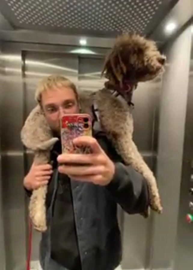 A blond man with glasses is taking a selfie video with a brown, curly haired dog riding on his shoulders in an elevator
