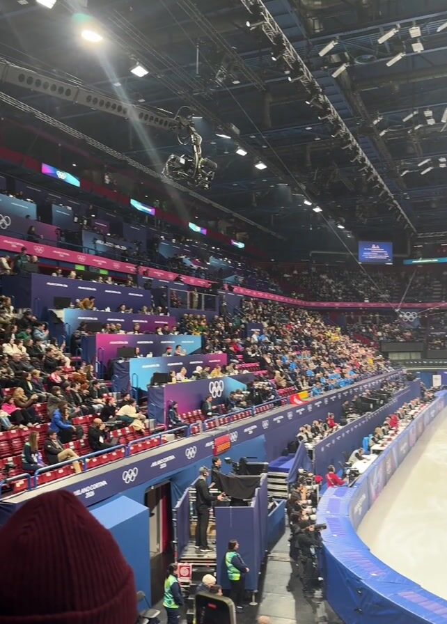person recording the warm-up of skaters at an ice skating rink. The rink is large and full of spectators. The video starts with a view of spectators in the stands, and then pans to the right, focusing on the ice rink where two skaters are warming up. There is a large screen above the rink showing the skaters. The arena is well-lit and has blue, pink and white lighting effects. Many people are holding phones and taking photos or videos. Loud music plays in the background.