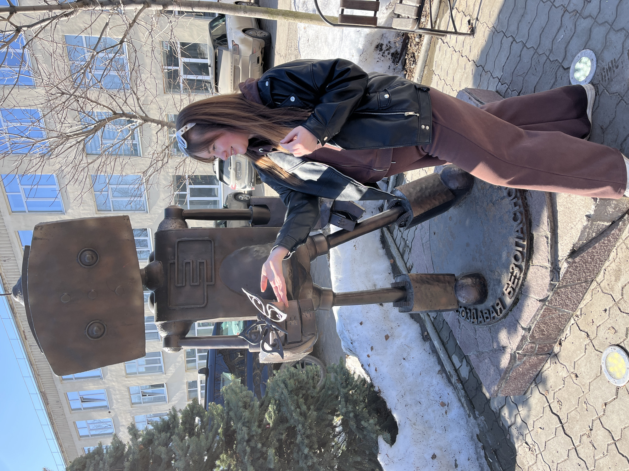 The image depicts a young woman interacting with a bronze sculpture located in the city of Chaikovsky, Perm Krai, Russia. The sculpture appears to be a stylized representation of industrial equipment. The woman, wearing a black leather jacket and brown pants, is standing next to the sculpture, with her hand positioned near a decorative butterfly element attached to the machinery. The ground is paved with a combination of patterned tiles and brickwork. Patches of snow are visible along the edges of the walkway, indicating a cold climate. A building with multiple windows is in the background, along with bare trees and parked cars.
