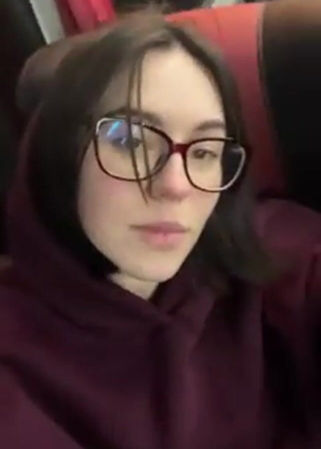 A young woman with shoulder-length dark hair and wearing maroon-framed glasses and a maroon hoodie sits in a bus seat. She looks directly at the camera, then down, and then to the side. The seat and window beside her are red and black. She appears to be indoors, likely traveling.