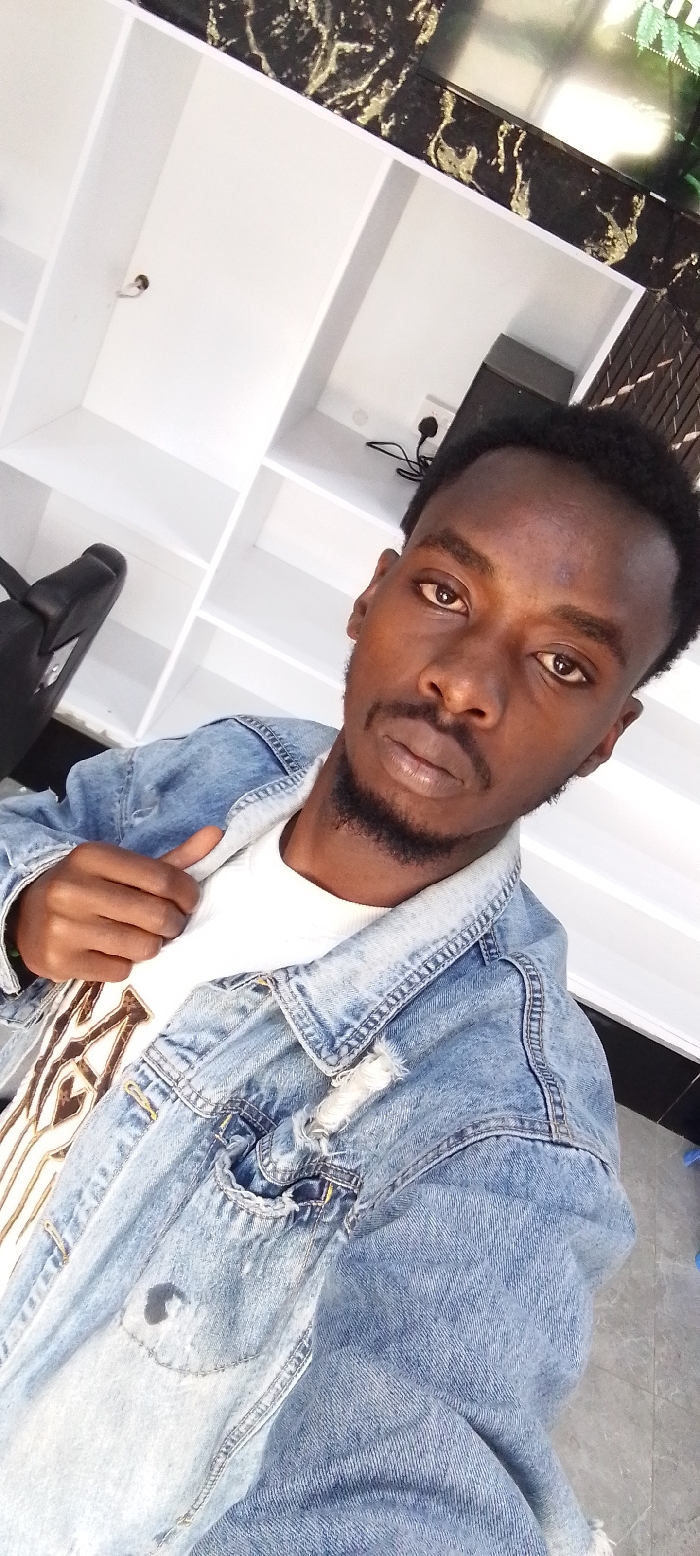A young Black man takes a selfie. He has short, dark hair and a groomed beard. He wears a white t-shirt and a light-wash denim jacket. Behind him is a white shelving unit with a black marbled surface at the top. A black chair is visible to the left. The background is bright, and the man is centered in the frame.