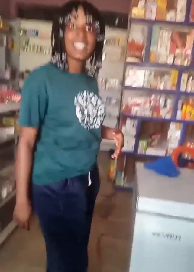 A young woman stands in what appears to be a pharmacy or small store. She is wearing a green t-shirt with a white design, dark blue sweatpants, and has her hair styled with braids and beads. The shelves behind her are filled with various medications and other products. She looks at the camera and smiles, then turns her head to look to her left. The interior of the store is brightly lit. There is a white refrigerator visible to the right of the woman.
