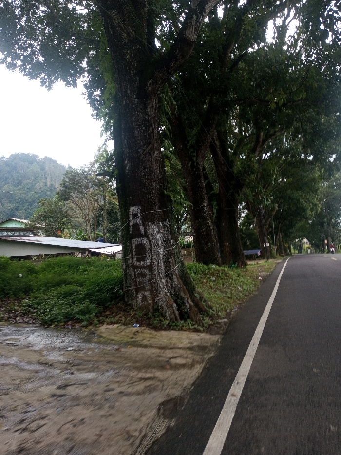 A view along a road lined with tall trees. The first tree on the left has white letters painted on its trunk. Behind the trees are buildings and a forested hillside. The road has a white line marking the edge. The road surface looks wet. In the distance, a small vehicle is visible on the road. The overall impression is one of a rural or semi-rural setting.