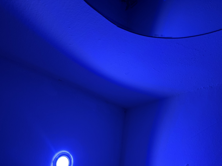 This image depicts an interior space located in Durimi, Nigeria. The scene is characterized by a strong blue ambient light originating from a circular, recessed fixture mounted on a flat ceiling surface in the upper-left quadrant. This fixture emits a bright white central light surrounded by a blue halo. The blue illumination highlights the textured surfaces of the walls. A vertical corner is visible in the upper-left to mid-left, marked by a soft shadow line. On the right side of the frame, a large, dark, curved object with a defined perimeter is present. This object possesses a reflective surface, showing subtle interactions with the ambient blue light. No human figures or active interactions are observed within the depicted environment.