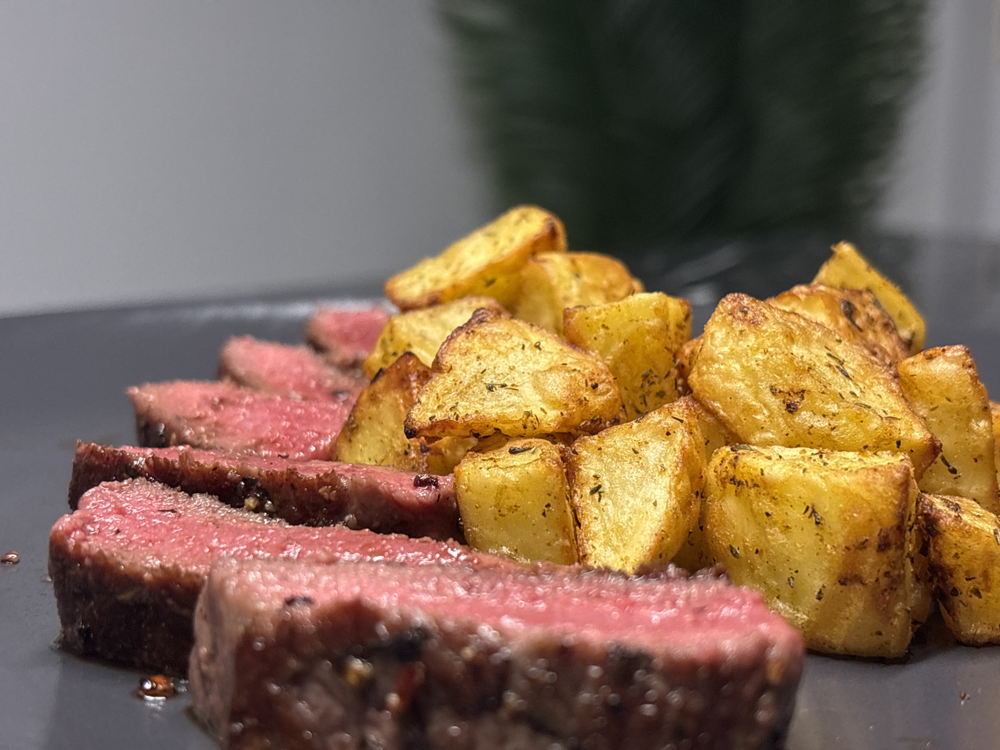 A plate with sliced medium-rare steak and roasted potatoes is presented on a grey surface