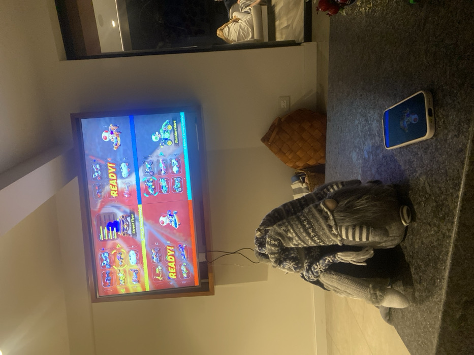 A television displays the Mario Kart 8 Deluxe character selection screen. A stuffed gnome with a grey knit hat and beard sits on a dark countertop next to a smartphone displaying a bright blue screen. A woven basket rests behind the gnome, against the wall. Above the TV, part of a glossy black cabinet is visible, reflecting light. The image is slightly rotated counter-clockwise.