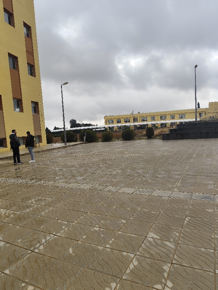 The image depicts an outdoor urban environment in Jibb as-Safa, Syria, under an overcast sky. The foreground features a large, paved area composed of light brown tiles with a repeating wave-like pattern, appearing wet in various sections. In the left mid-ground, two male individuals are standing. The individual on the left wears a dark jacket, dark trousers, and a dark backpack, with dark shoes featuring white soles. The individual on the right wears a dark jacket, light-colored trousers, and white athletic shoes. Both are positioned facing generally towards the right side of the frame, appearing to be engaged in conversation or standing together. To their left, a multi-story building with a yellow facade and vertical brown panels between rectangular windows extends upwards, partially out of frame. A tall, dark streetlight stands in the mid-ground, centered horizontally. Beyond the paved area and the individuals, a strip of low, rounded shrubs and sparse vegetation is visible. Further in the background, a long, lower-height yellow building with multiple windows and a covered structure along its base is situated on slightly elevated terrain. Another tall, dark streetlight is present in the far right background. A dark, tiered structure is visible in the right mid-ground. The overall environment suggests a campus or public plaza setting.
