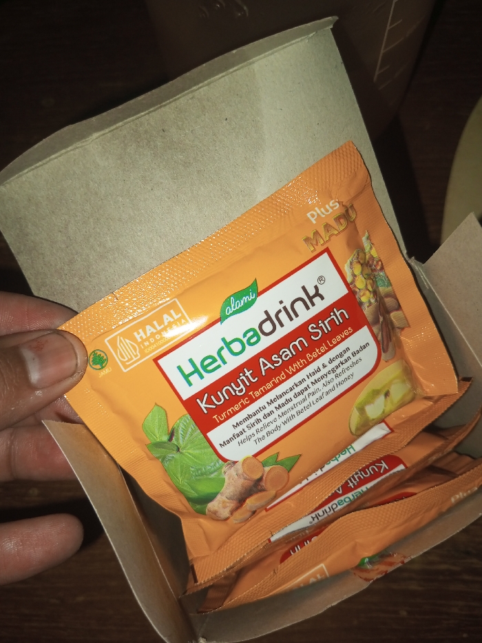 small, open cardboard box filled with orange packets of "Herbadrink Kunyit Asam Sirih Plus Madu." The packets are labeled with a green "Halal Indonesia" certification. The product is described as a turmeric tamarind drink with betel leaves and honey. It claims to help with menstrual pain and refresh the body. A picture of turmeric and betel leaves are present on the packaging.