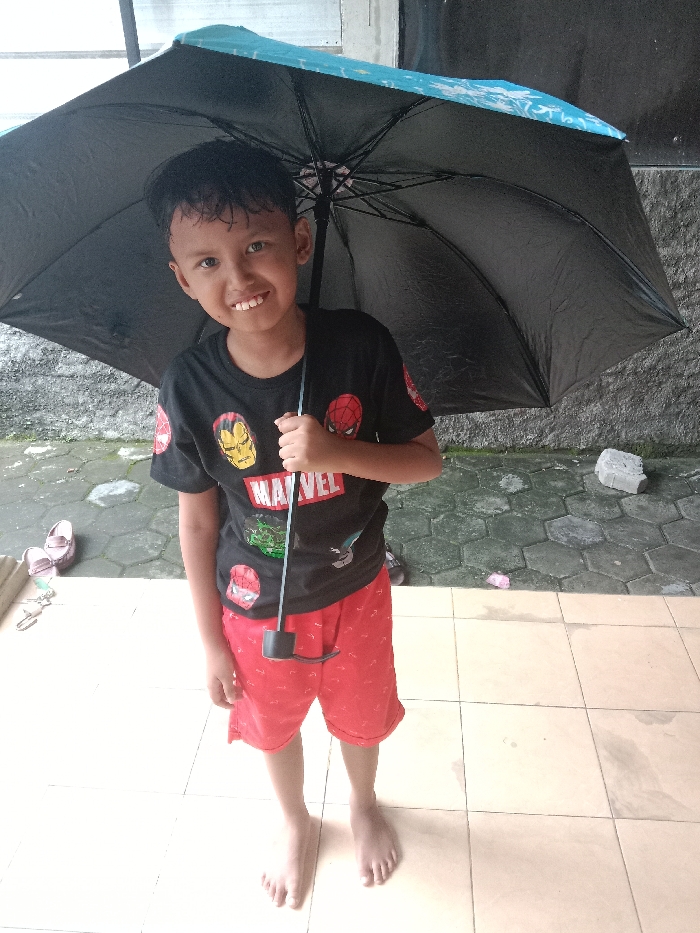 An image taken in Madiun, Indonesia, depicts a young male child standing outdoors, holding an open umbrella